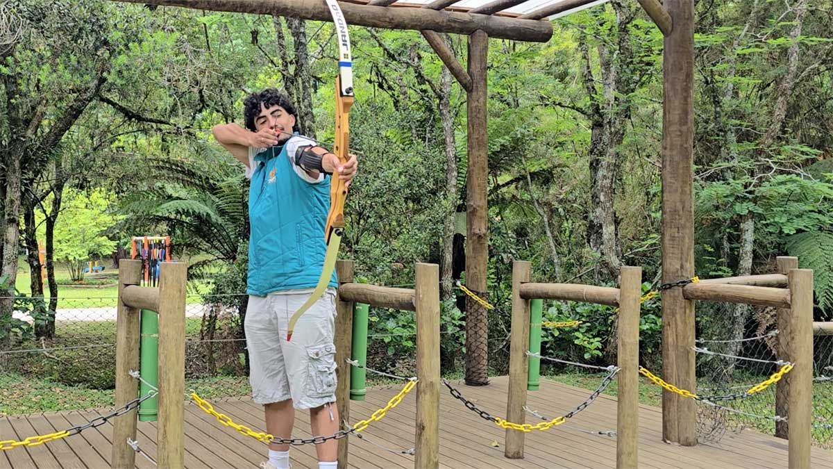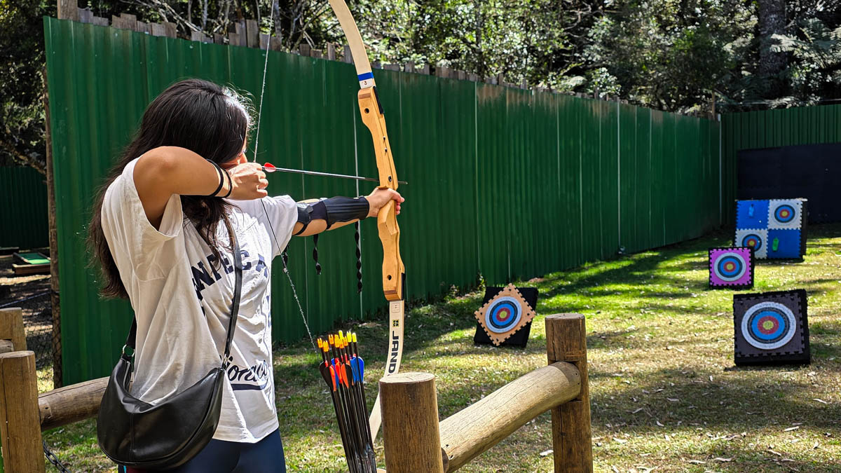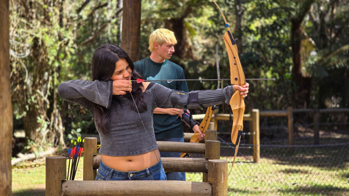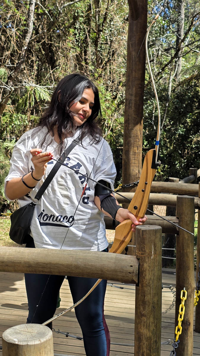 O arco e flecha é uma atividade em que você dispara flechas com um arco em direção a um alvo, exercitando foco, coordenação e precisão, sempre com segurança e orientação de um instrutor e ainda em um bosque muito bonito.